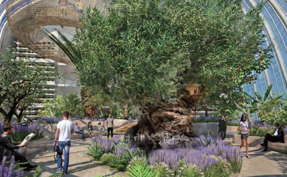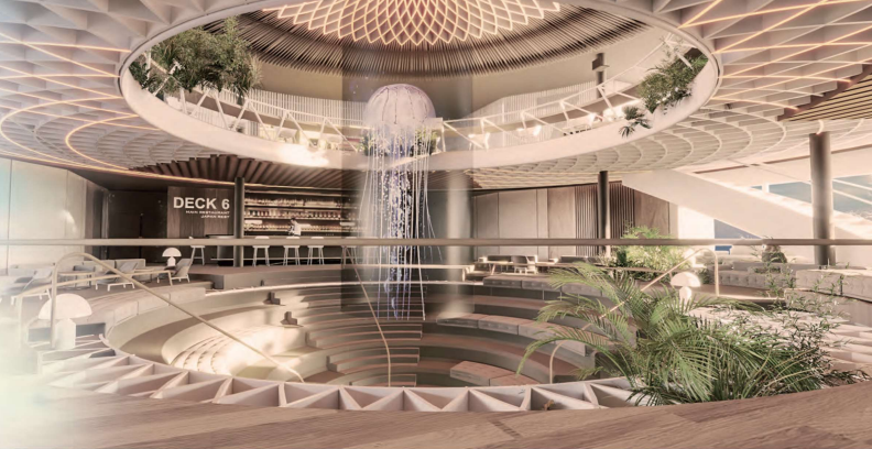 『ガーデンズ・バイ・ザ・ベイ (シンガポール)』に代表される、世界の名だたる「グリーンインフラ」の設計に携わったアンドリュー・グラント氏が設計を行っています。パークの中央には、出会いと憩いの場の象徴となる“ピースッリー”が配置され、世界各地のめずらしい植物を楽しむことはもちろん、森林浴や野菜の水耕栽培も可能。エコシップが目指す、自然と共存する船内生活の中心的なエリアです。さらにここは船内の空気のリフレッシュゾーン。いわば「洋上のアマゾン」としての役割も果たします。