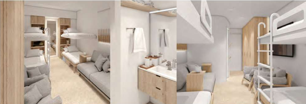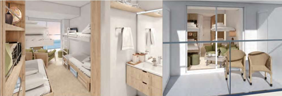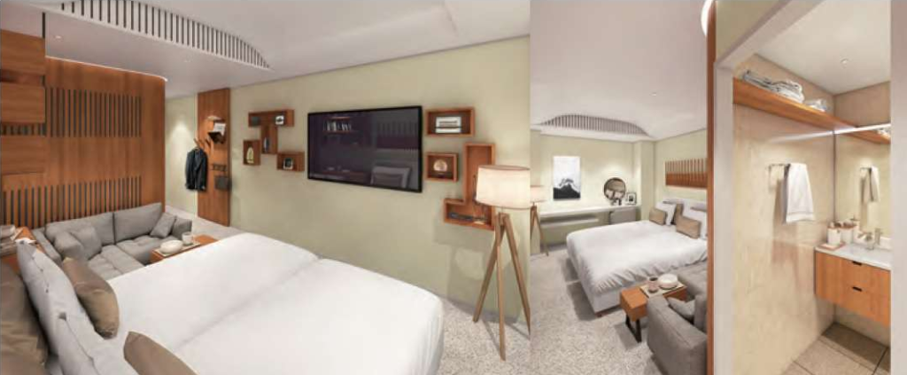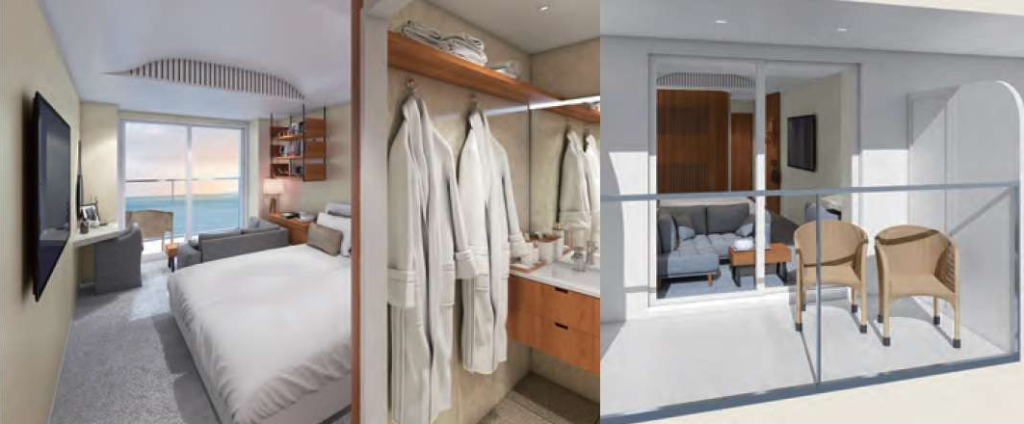エコシップの客室は、持続可能な素材を使用したデザインが採用され、従来のクルーズ船よりも快適性が向上 すると期待されています。全客室には省エネ型の空調システムが導入されており、エネルギー消費を抑えながら快適な室温を維持します。